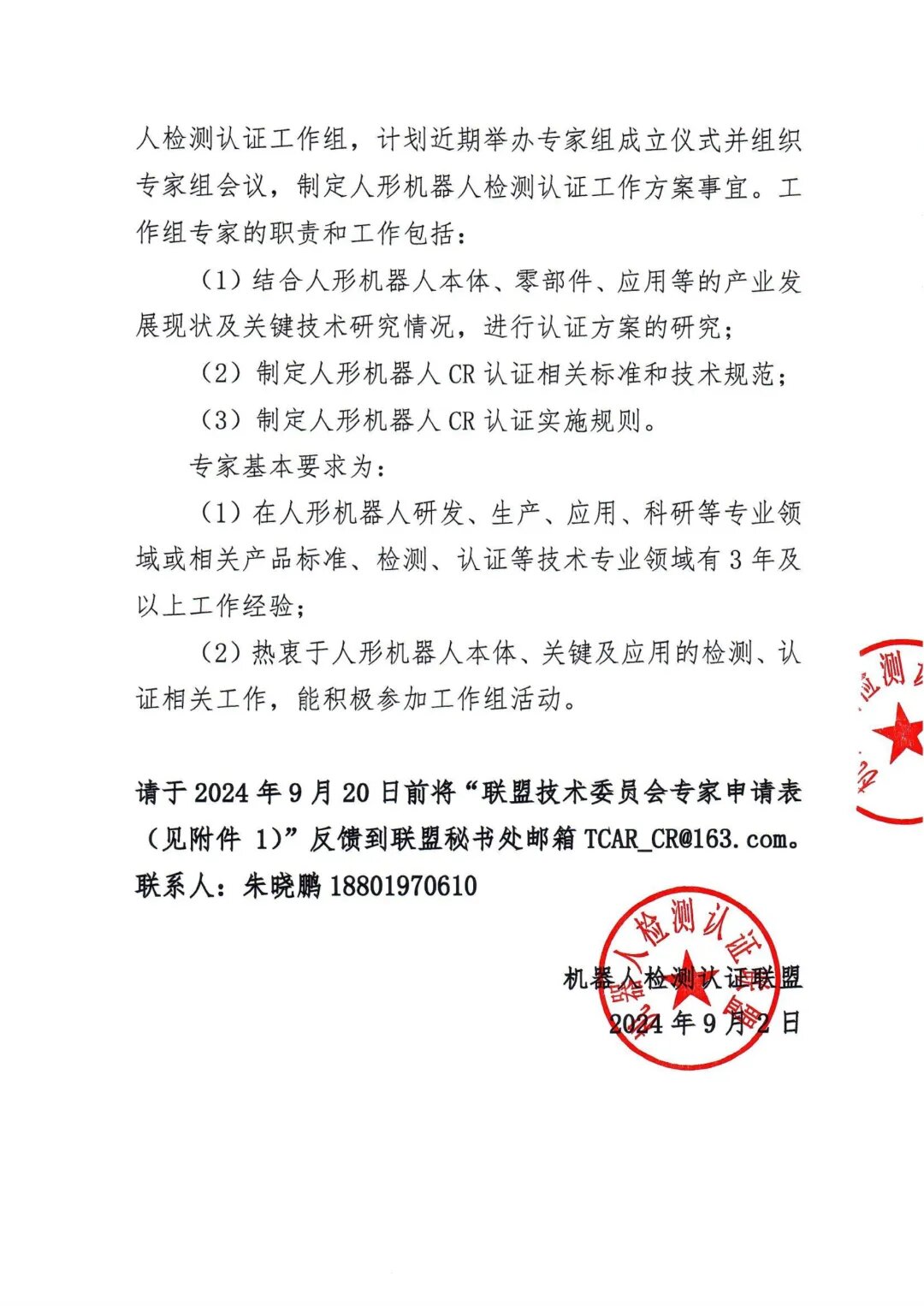 关于筹建中国机器人(CR)认证——人形机器人检测认证工作组的通知.pdf
