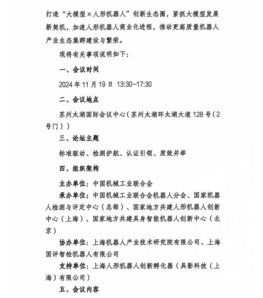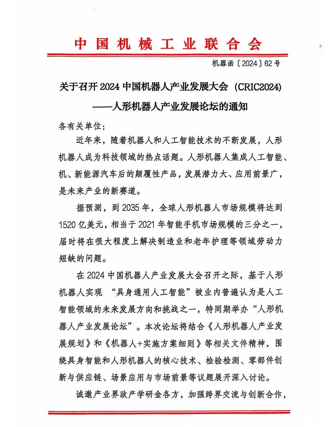 关于召开2024中国机器人产业发展大会(CRIC2024)——人形机器人产业发展论坛的通知