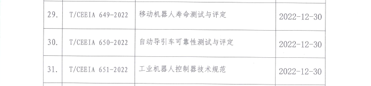 2022年12月,由中电协电气场所用机器人安全与检测标准化专业委员会归口的《移动机器人寿命测试与评定》、《自动导引车可靠性测试与评定》、《工业机器人控制器技术规范》3项团体标准正式发布。